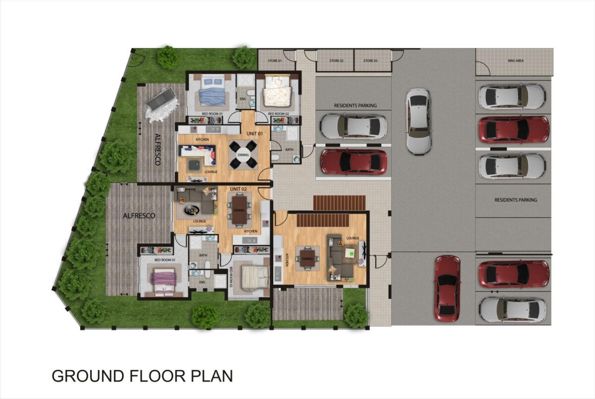 - Huge open plan apartments with timber laminate floors.