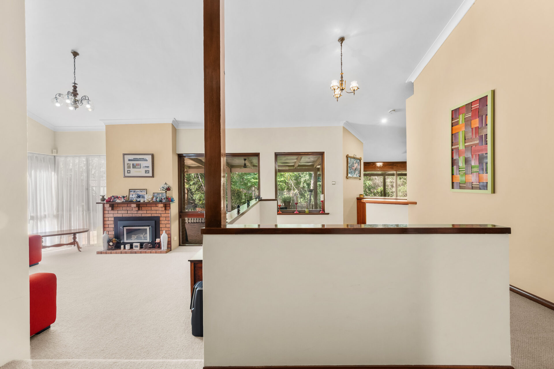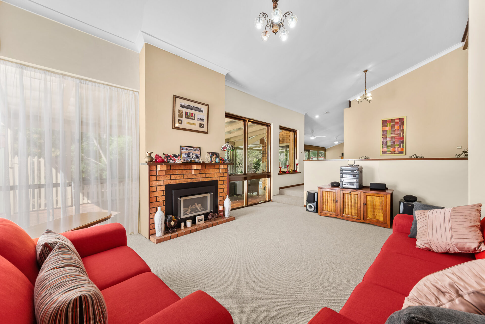 Inside, the home is open, light-filled and cleverly zoned to suit busy family living. Raked ceilings, split levels and expansive windows create a sense of space while framing the leafy outlook from every living area. The sunken lounge, complete with gas fireplace, is perfect for cosy nights in, while the adjoining dining and family zones comfortably accommodate larger gatherings.