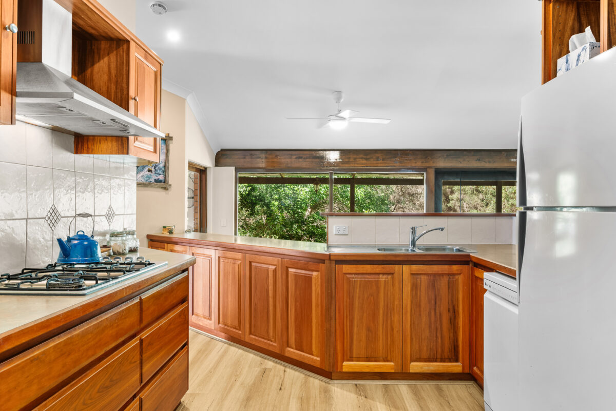 The country-style kitchen sits at the heart of the home, elevated to capture the view while allowing easy connection with both indoor and outdoor living spaces. Long benches, ample storage, quality appliances and a double fridge recess make it ideal for family meals, entertaining and weekend hosting. Outdoors, the shaded veranda and alfresco areas spill directly toward the brook, creating a peaceful retreat ideal for entertaining, unwinding or simply enjoying the changing seasons.